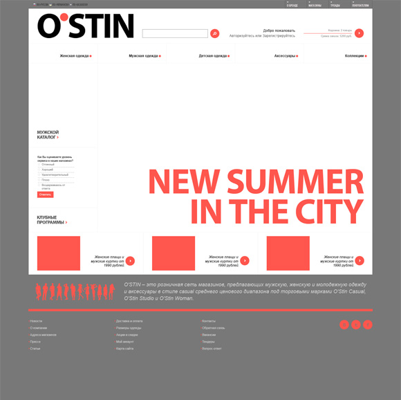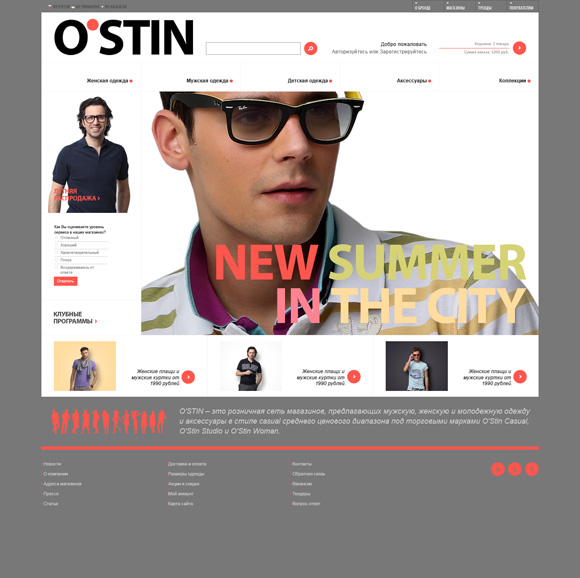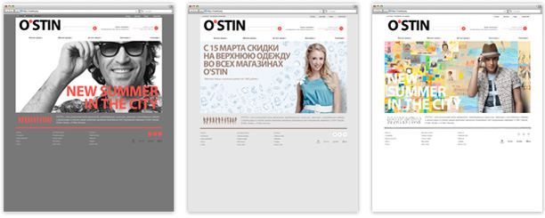 Концепция интернет-магазина одежды O'STIN предполагала стандартный лэйаут и множество скинов, в зависимости от текущей промо-кампании, направленности коллекции и сезонности.